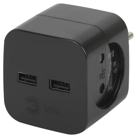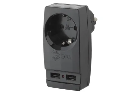 Тройник ЭРА SP-2-USB-B 2гн, без заземл.(10A) (черный)