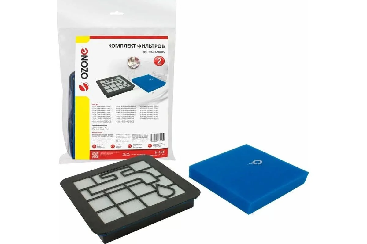 Комплект микрофильтров OZONE H-135 предназначены для использования в бытовых пылесосах и являются важным элементом в очистной системе, изготовлены из прочного синтетического материала, рассчитаны на многоразовое использование и моются. Фильтры предназначены для тонкой очистки воздушного потока, задерживают микрочастицы пыли и грязи, а также продукты жизнедеятельности домашних животных и другие мельчайшие частицы мусора, это позволяет сделать дом чистым и безопасным. За счет уникального рельефа поверхности микрофильтры имеют увеличенную в 2 раза площадь фильтрации, это повышает уровень очистки воздуха и ресурс работы фильтра на 50%. Также чистоту воздуха на выходе обеспечивает специальная губчатая структура фильтровального материала. Дополнительные микрофильтры из специального синтетического материала защищают двигатель пылесоса от попадания мельчайших частиц.